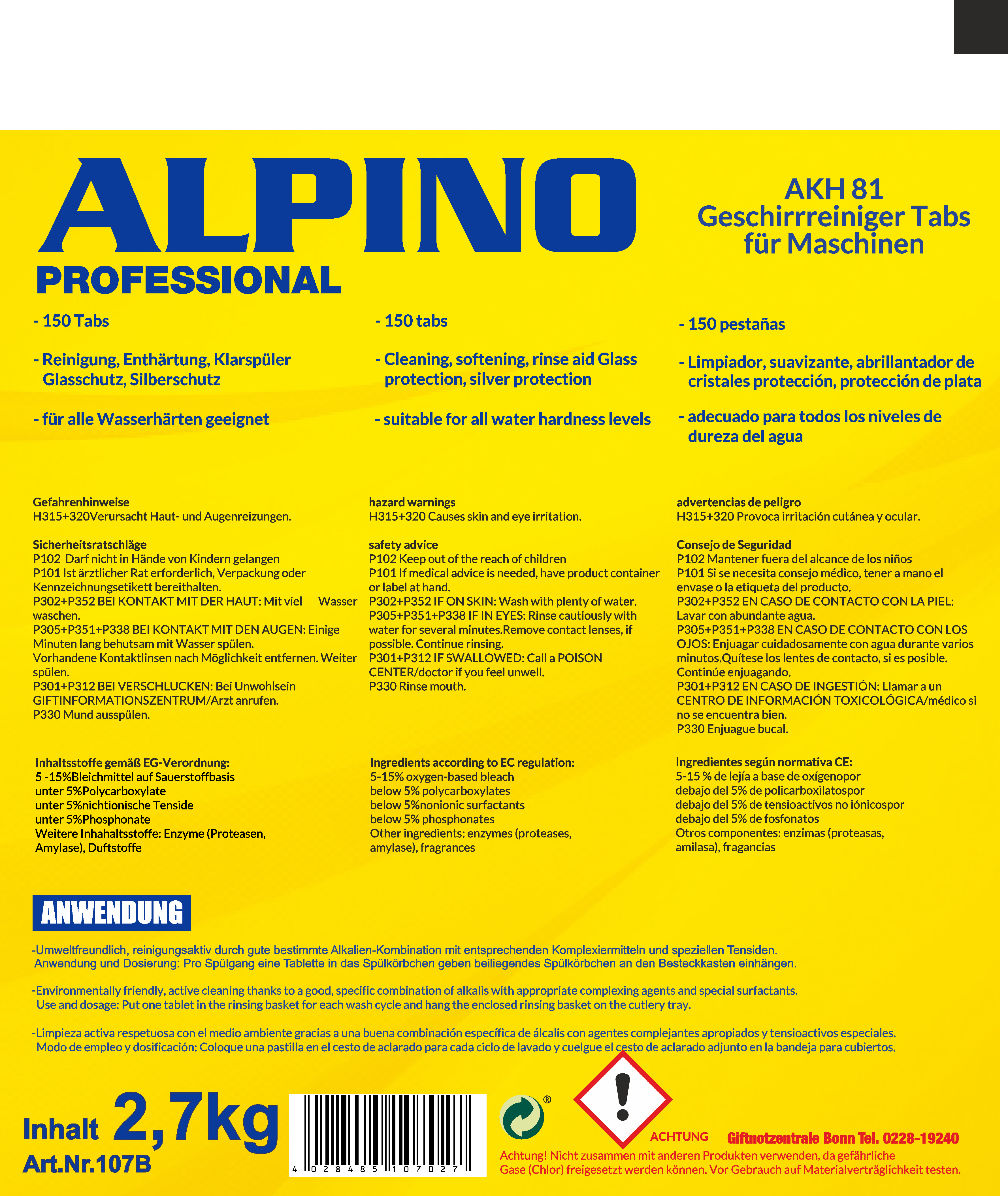 Lagern Sie die Tabs trocken und bei Raumtemperatur, um die volle Wirksamkeit zu erhalten. Bei sehr hartem Wasser über 21 °dH empfiehlt es sich, zusätzlich Regeneriersalz in die Maschine zu geben. Die Packung mit 150 Tabs (2,7 kg) reicht bei täglichem Einsatz mehrere Monate und eignet sich besonders für Betriebe mit hohem Spülaufkommen.
